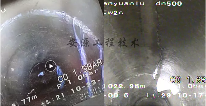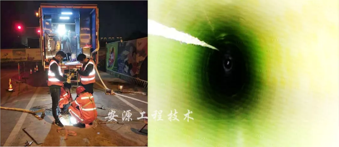 針對(duì)本段管段無法開挖、修復(fù)施工難度較大的特點(diǎn),鄭州安源工程分別采用了“高聚物注漿”和“UV-CIPP”兩種非開挖修復(fù)技術(shù),對(duì)該污水管道進(jìn)行修復(fù)。